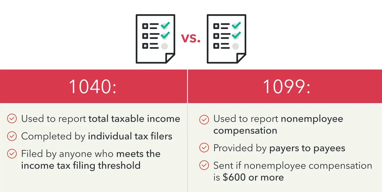 One of the major differences between 1040 and 1099 lies in tax responsibility.